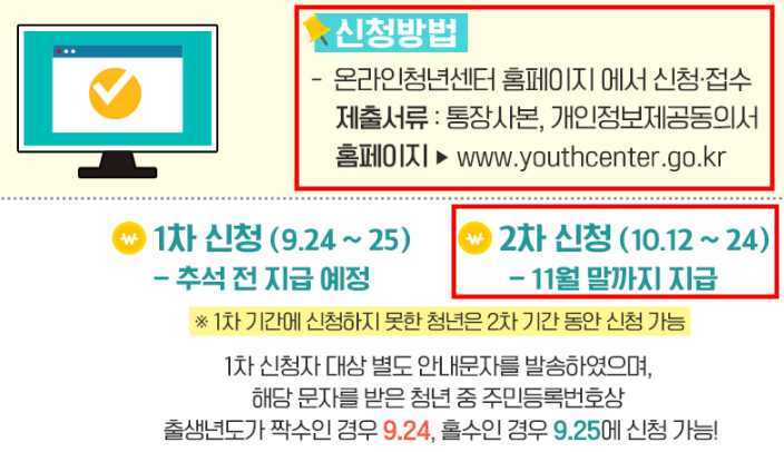 온라인 청년센터라는 아래 그림에 주소(youthcenter.go.kr)에서 신청하실수있습니다. 통장사본과 개인정보제공동의서를 제출하시면 간단하게 신청하실수있습니다. 2차 신청 기간은 10월24일까지이고 청년특별구직지원금 지급일은 11월말가지 입금 예정입니다.