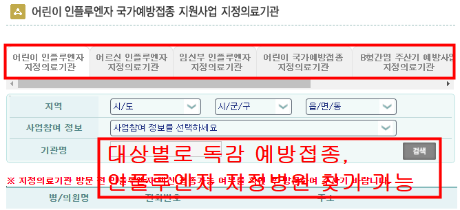 뜸들이지않고 바로 사이트 알려드렸습니다. 아래 그림에서 보시다시피 어린이, 어르신, 임산부 독감 무료 접동 대상자별로 지정병원 조회가 가능합니다. 자세한 내용은 밑에서 참조하시기 바랍니다.