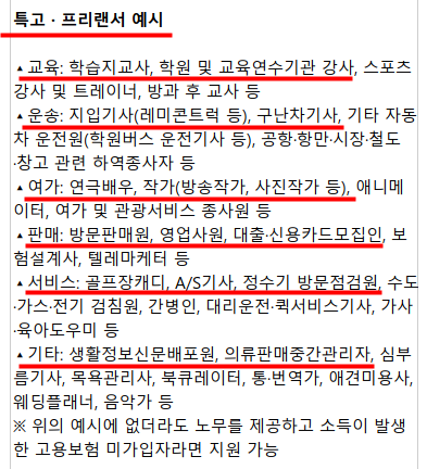 1. 프리랜서, 특수고용직 형태 근로자, 노동자는 학원강사, 영업 판매원, 배우, AS 기사님, 운송업 종사자 등 폭넓게 포함되며 대상 직업을 밑에 표로 정리해놨습니다.