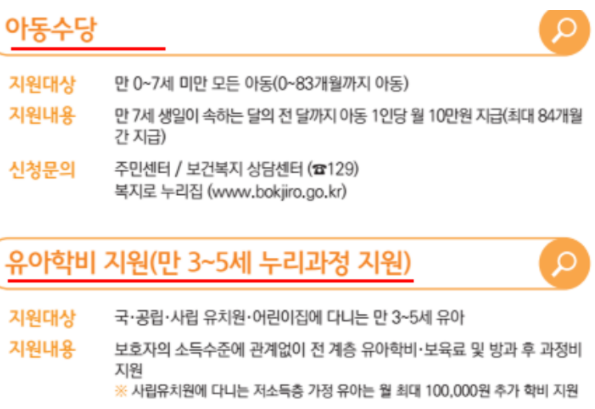 그리고 유아학비 지원의 경우에는 국공립 및 사립유치원, 어린이집에 다니는 만3~5세 사이의 유아를 지원하는 복지 제도입니다. 소득수준에 관계없이 전 계층 유아학비,보육료, 방과후 과정비 등을 지원합니다.