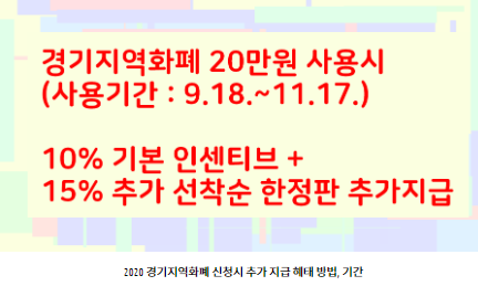 예를들어 20만원의 경기지역화폐를 충전해서 경기도에 곳곳에 있는 가맹점과 사용처에서 지출을 하면 소비지원금을 25%를 지원해주는데, 중요한 것은 기간이 위에서 보시는것처럼 정해져있습니다. 9.18~11.17.사이에 2개월간 사용한 금액의 15% 인센티브를 소비지원금으로 지급해줍니다.