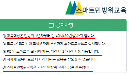 2020 스마트 민방위 교육 기간은 2020.9.1.~11.30.으로 되어있네요.