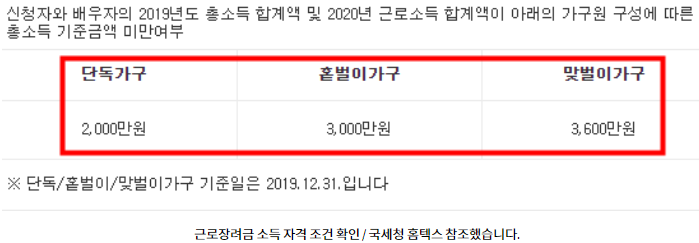 3,600만원 미만의 맞벌이 총소득이시면 2020 근로장려금 소득 조건을 충족하게 됩니다.