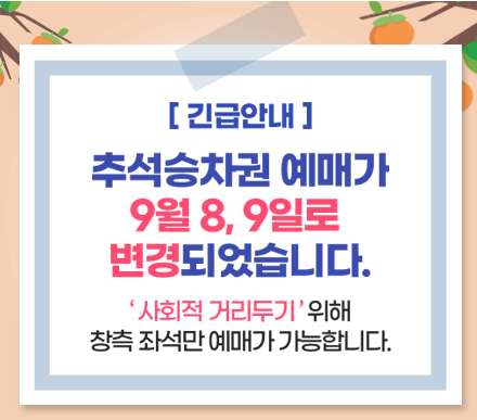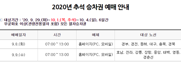 2020년 추석 코레일 기차표 예매 시기는 9월 8일과 9일로 변경되었습니다.