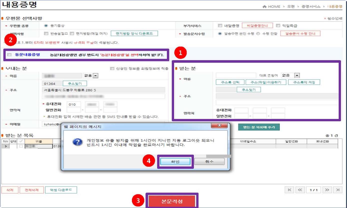 간단하게 본인인증으로 로그인하고 내용증명 신청을 하시면 됩니다.