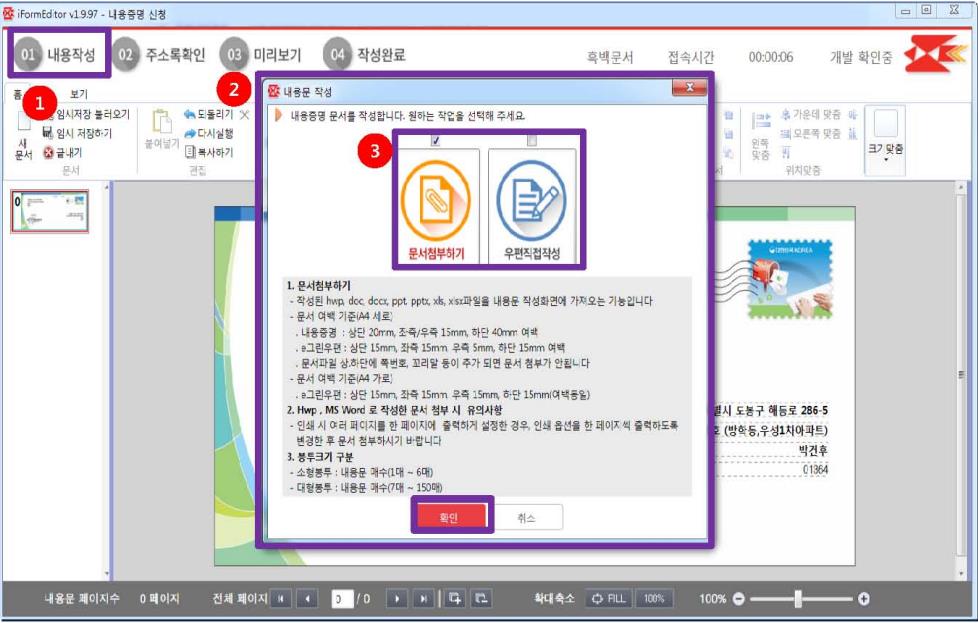 2. 내용증명 편집기를 통해서 보낼 서류를 업로드하거나 작성할수있습니다.