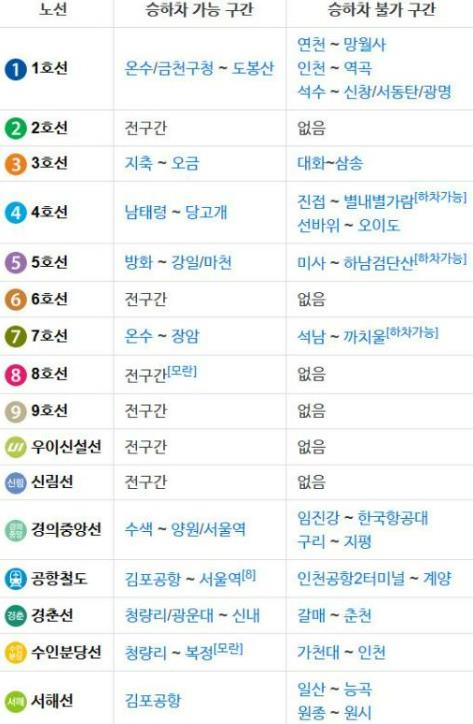 (경기도 하차 가능 지하철 : 아래표 참조).
