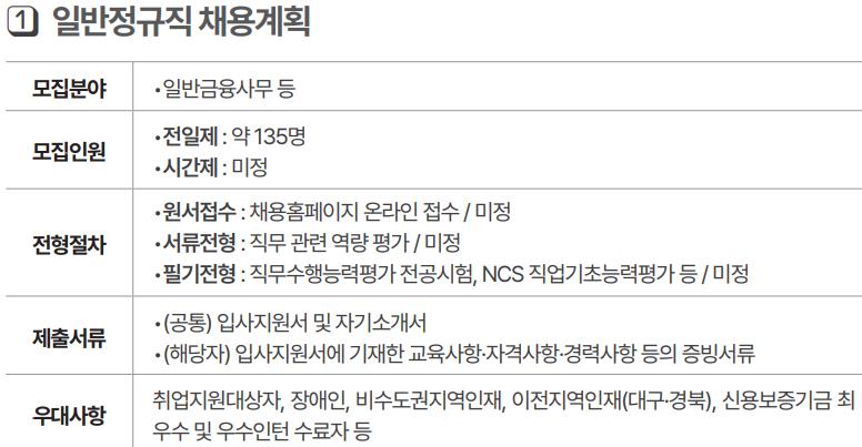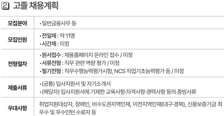 7. 채용시 우대사항 : 취업지원대상자, 장애인, 비수도권지역인재, 이전지역인재(대구·경북), 신용보증기금 최우수 및 우수인턴 수료자 등(채용계획 확정 전이므로 변경 가능).