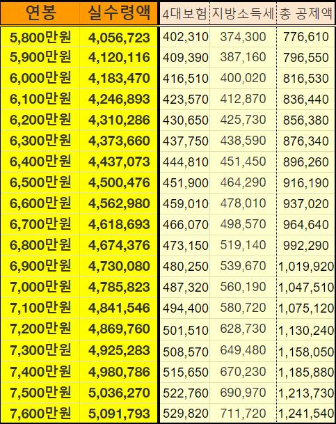 이렇게 연봉 실수령액표를 정리해서 알려드렸습니다.