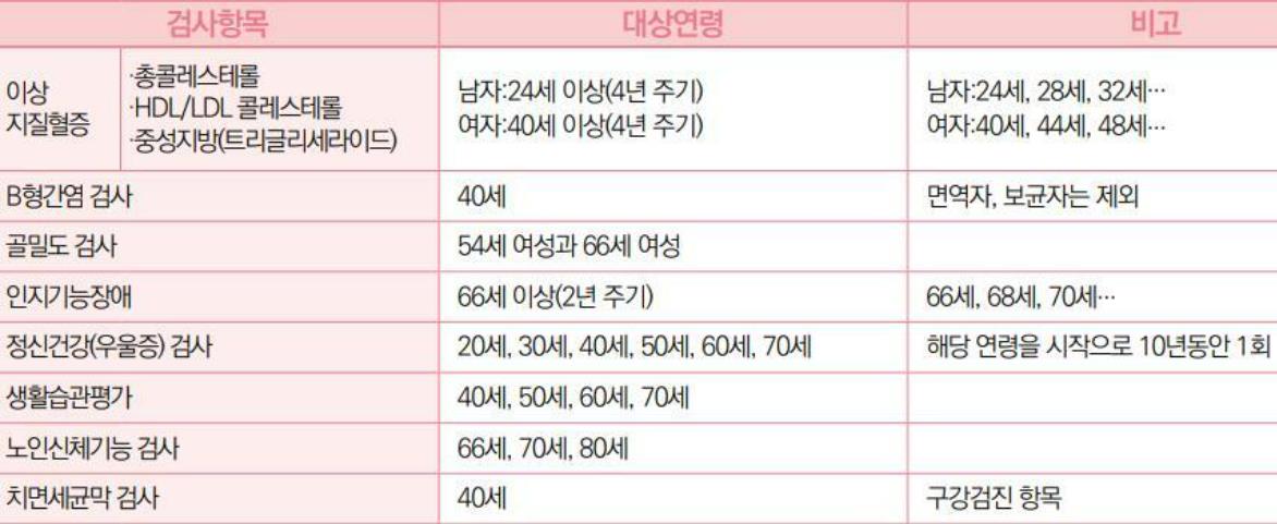 생애주기별로 국가건강검진 항목이 다릅니다.