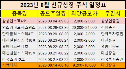 2023년 8월에 신규 상장하는 주식들을 표로 정리했습니다.