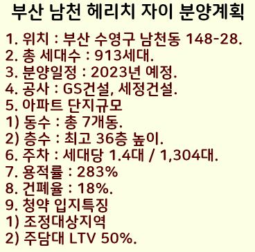 부산 수영구 남천동에 헤리치 자이 아파트 분양계획을 정리했습니다.