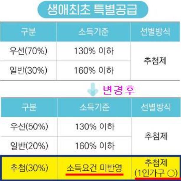 그냥 특별공급과 일반공급 85제곱미터 이상 추첨제 50%분양물량을 지원하는것이 훨씬 효율적입니다.