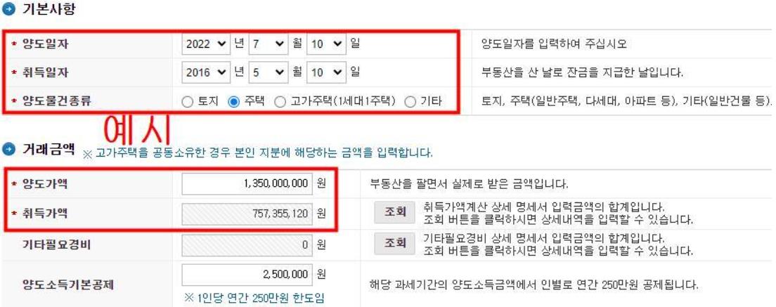 세번쨰. 취득일자와 금액, 양도일자와 매도가액 정도만 입력하셔도 양도소득세를 확인할수있습니다.