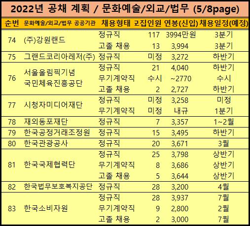 계속 아래 2022년 문화예술 및 외교, 법무분야 공기업 채용계획입니다.