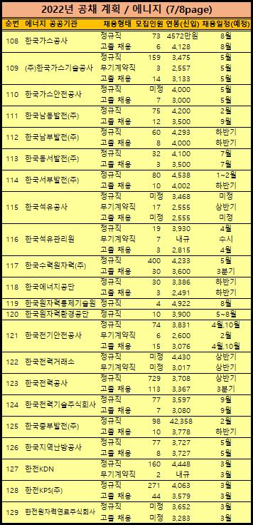 7. 에너지 개발 및 기술분야 공기업 채용계획 : 22곳.