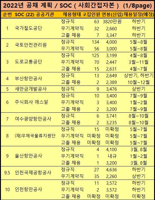 1. SOC(사회간접시설) 관련 공기업 채용계획 : 22곳.