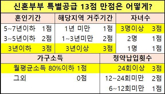 평균적으로 신혼부부 특별공급 청약 당첨점수는 수도권 인기아파트 기준으로 최소 11점은 넘어야합니다.