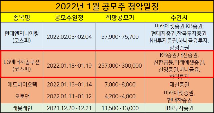 추가적으로 2022년 1월 공모주 청약일정들을 표로 만들었는데요.