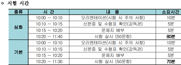시험시간은 심화시험과 기본시험 모두 10시에 시작합니다.