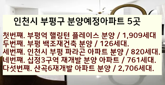갈산1구역처럼 인천시 부평구내에 분양예정인 다른 아파트들 5곳을 알려드리겠습니다.