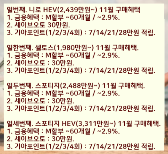 아래 기아자동차 11월 판매조건 재고차 할인혜택을 정리하였습니다.
