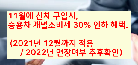 또한 2021년 12월까지 코로나로 침체된 경기를 살리고자 승용차 개별소비세를 30% 인하 혜택을 볼수있습니다.