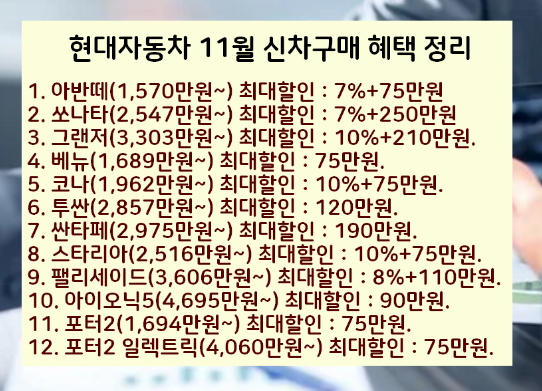 구매하고자하는 11월 현대자동차 신차 혜택이 없다면 현대자동차 홈페이지에 들어가서 확인해보세요.