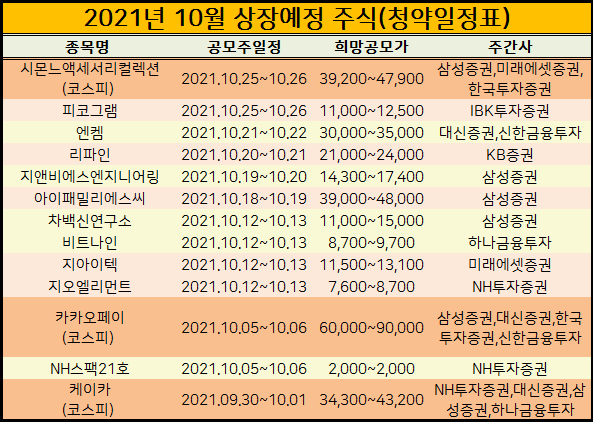 2021년 10월 공모주 청야일정을 정리해서 표로 만들었습니다.