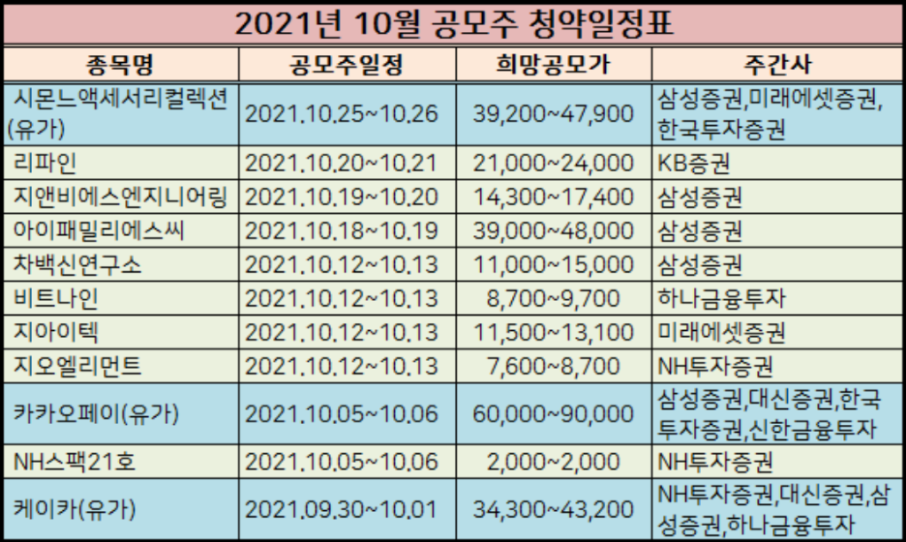 추가적으로 2021년 10월 공모주 청약일정표와 추천 상장주식들을 첨부하였으니 참고하세요.