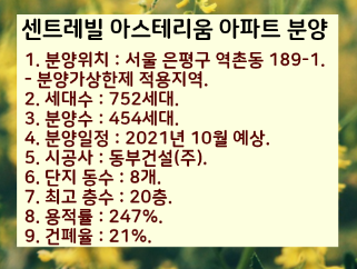 이렇게 2021년 10월이후에 분양이 예상되는 서울특별시 은평구에 역촌동에 분양하는 센트레빌 아스테리움 시그니처 아파트 분양에 대해서 알아봤습니다.