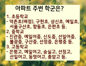 3. 고등학교 : 은평고, 예일여고, 숭실고, 선정고, 선일여고, 동명여고, 충암고 등.