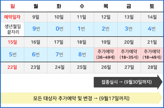 추가예약기간은 8월19일부터이며 접종실시는 9월30일까지이니 아래표를 참고하세요.