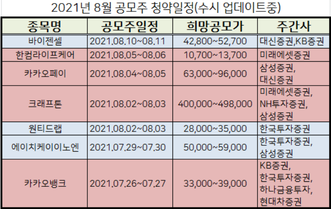 아래 202년 8월 공모주 청약일정도 표로 정리해놨으니 참고하시기 바랍니다.