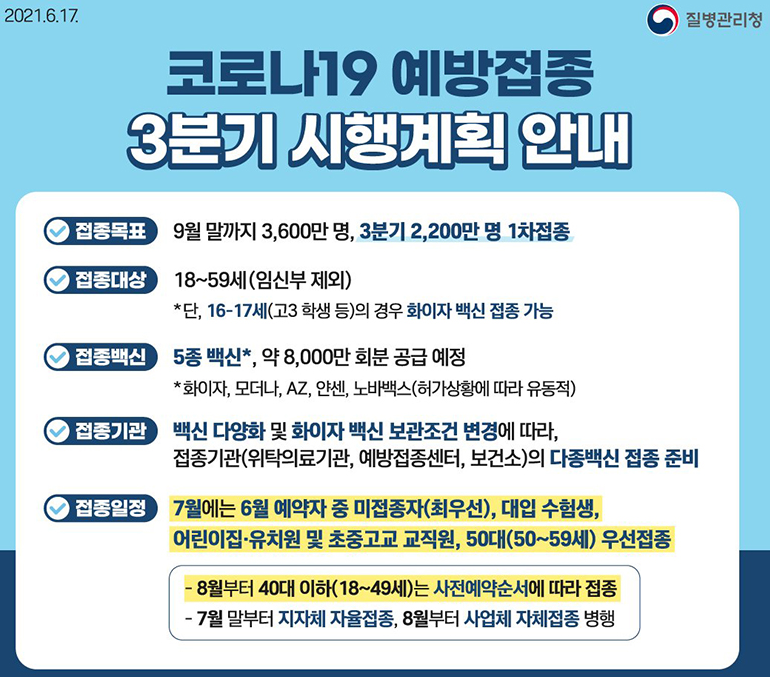 모더나, 화이자, AZ 등 백신을 접종할 예정이며 7~9월에는 2,200만명이 1차 접종을 완료할 예정입니다.