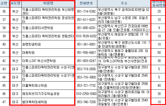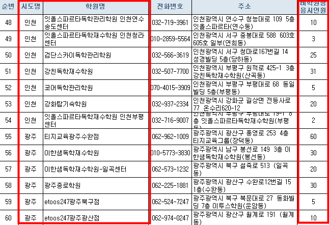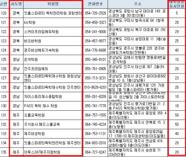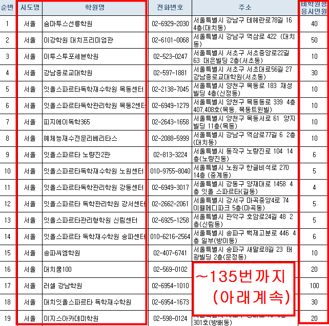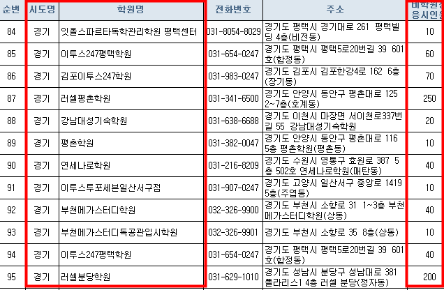 학원 목록표에서 세부사항이 잘 안보이는분들은 맨 아래쪽에 한국교유과정평가원 홈페이지에세 엑셀파일로 올려놨으니 엑셀파일을 받아서 확인하세요.