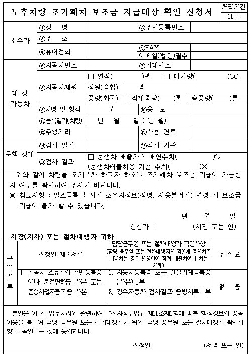 오늘은 노후차량 조기폐차 보조금 지급대상 확인 신청서를 작성하는 방법을 알려드리겠습니다.