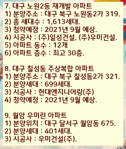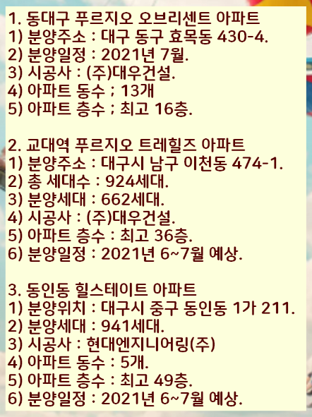 알려드린 대구시에서 7월부터 12월까지 분양하는 아파트 청약 예정 일정은 참고로 읽어보시고 정확한 청약일정과 분양가, 평면도 등은 시공사 홈페이지에서 재확인하시기 바랍니다.