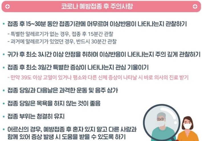 그러기 위해서 예방접종한 의료기관에서 최소 30분을 머물면서 알레르기나 두드러기, 흉통, 두통, 발작, 기절, 호흡곤란 등 주사에 대한 알레르기 반응을 관찰하는것이 좋습니다.