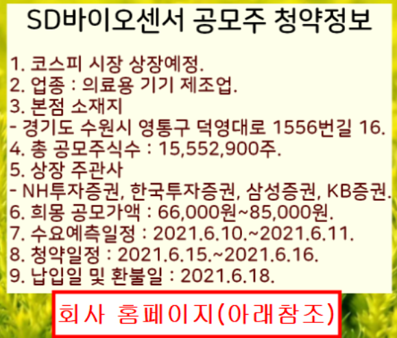 이상으로 6월15일부터 16일, 2일동안 진행되는 SD바이오센서(에스디바이오센서) 공모주 상장정보와 청약방법 및 일정 등을 상세히 알려드렸습니다.