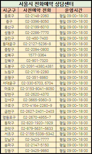 서울의 경우에는 백신접종 사전예약 전화번호표를 아래에 첨부하니 참고하시기 바랍니다.