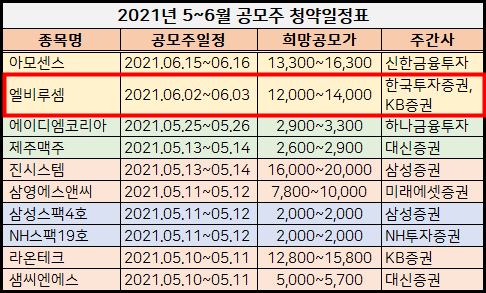 엘비루셈 공모주 청약은 2021.6.2.~6.3.동안 진행합니다.