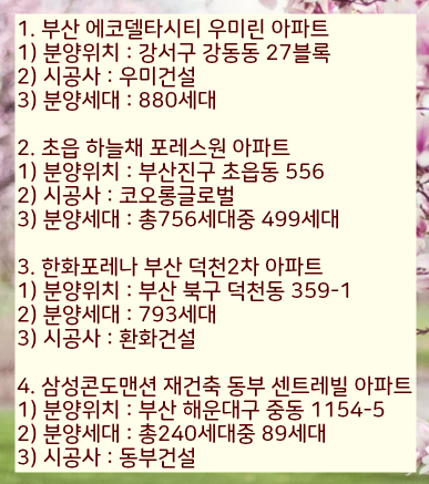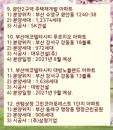 위에서 알려드린 5월~12월 부산 분양예정 아파트 계획을 확인하시고 청약 지원하시기 바랍니다.