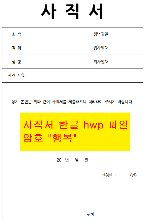 1. 주민등록번호 개인정보를 입력하는 사직서 양식