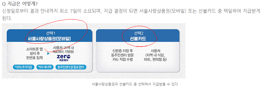 서울사랑상품권이나 선불카드 중 선택해서 받으실수있습니다.