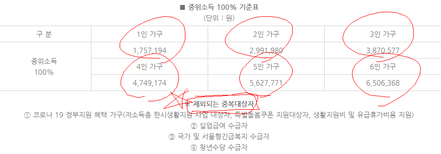 기존에 저소득층 한시생활지언 사업 대상자, 특별돌봄쿠폰 지원대상자, 생활지원비 및 유급휴가 비용지원, 실업급여 수금자, 국가 및 서울형긴급복지 수급자, 청년수당 수급자 등 생각보다 많은분들이 중복 혜택자로 받으실수없으니 꼭 참고 바랍니다.