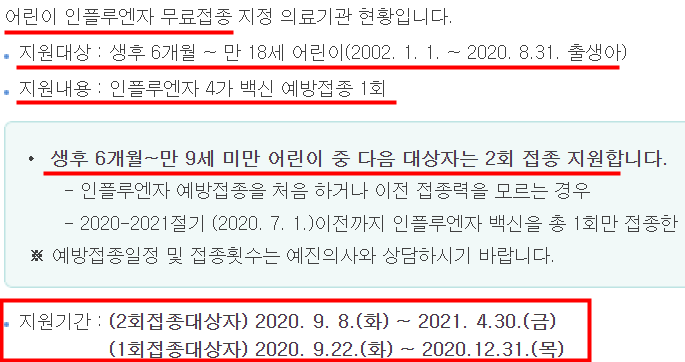 2020년 독감 예방접종 대상자분들은 무료로 지정병원에서 백신지원이 가능합니다.