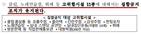 그리고 여전히 표에서 보시는것처럼 사회적 거리두기 2단계에서는 클럽과 노래방, 뷔페, 주점 등은 고위험시설 11종으로 분류되어서 이용이 불가능합니다.
