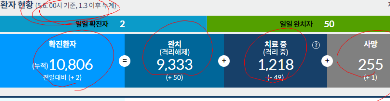 다행히 코로나 확진환자 일별 발생 및 누적오나치, 치료추세가 점점 줄어들고있어서 다행입니다.