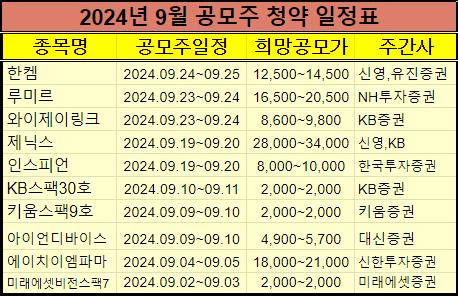이렇게 2024년 9월 신규상장 주식일정을 표로 정리했습니다.